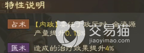 在内政方面,玩家如果将虞翻委任到政厅当中可以将全图有效地得到提升,产量最多可以提升百分之0.15这个数值看起来比较小,但是真当玩家利用在游戏当中时可以发现这小小的0.15%能带给玩家的是极大的资源产量。