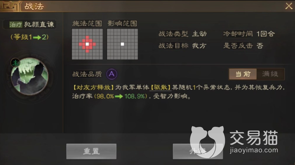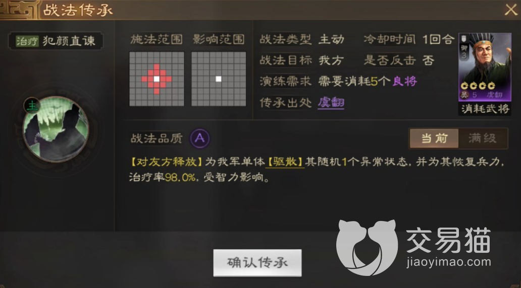 虞翻的战法在游戏当中主要做治疗使用,可以在一定范围内为我军提供治疗。因此虞翻如果必要参与战斗主要的战场也是阵容的后方,为军队做后勤保障治疗使用。