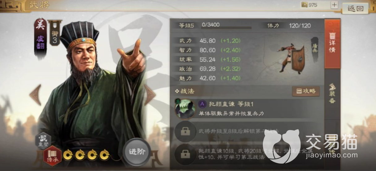 虞翻单从属性来看可以看到只有智力占了一些上风,其余的数值都不太行。那么主要用呢智力战斗的将领在游戏当中肯定是作为谋臣使用了,那么内政才是虞翻能够发挥自己力量的地方。