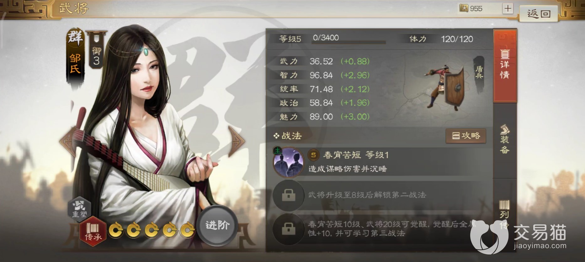 也可以用邹氏,不仅能造成单体谋略伤害还能令其沉睡,传承战法还有缴械功能,可以说是满满的控制。这两位定下之后,还需要另一个盾兵武将来顶前排,单个坦度不足,推荐董卓或者同类型的其他下位替代紫卡。再配1~2个输出向的弓兵武将,例如审配、徐荣,或者同样配骑兵武将例如李傕、何进。