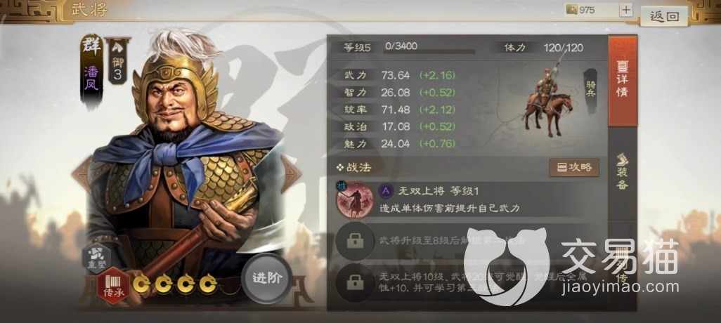 在这款游戏中潘凤是统帅骑兵的武将,武力值和统率值尚可,自带被动战法能在造成单体兵刃伤害之前先提高自己的武力值,提升幅度为自身武力值的10%再额外加32点,不得不说这个提升幅度还是蛮高的。并且如果目标是处于控制状态,还能额外降低统率值,持续1个回合。