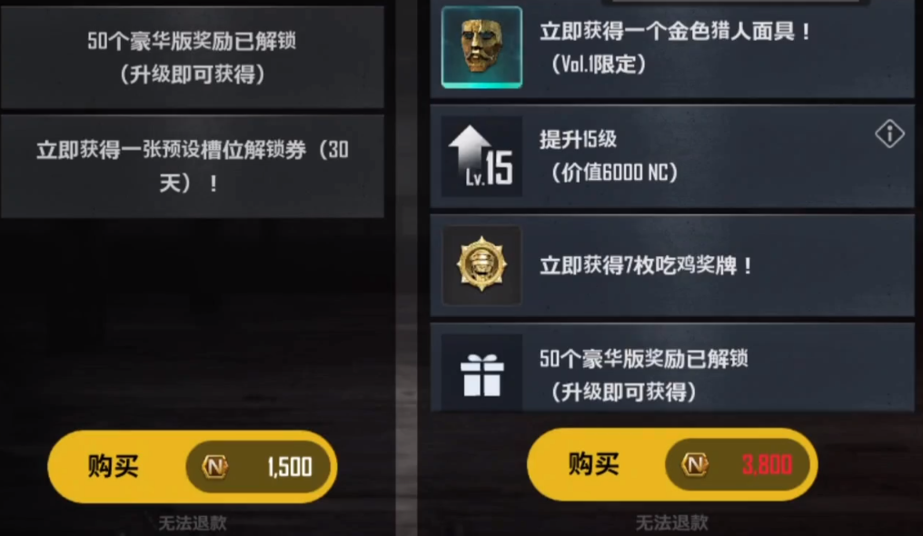 总共有两个档位的解锁方法有1500档位以及3800档位两档可以选择,两个档位价格不同当然会有些许的区别,都是可以获取五十个豪华的奖励,但是买后一个档位的多出了七个奖牌十五级和一个限定的金色面具。