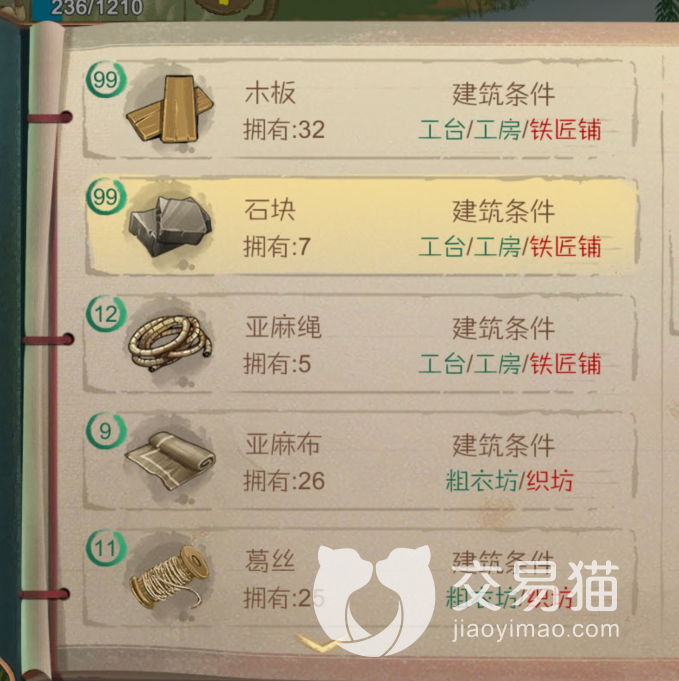 食物问题解决最后就是科技了,游戏的前期,尽量分配两名年轻男性吃了效率buff之后去采石头,首先从模板,亚麻布和葛丝开始之后在采集石头,按顺序采集要不乱了前后,因为游戏中是有四季变化的所以需要添加衣物而亚麻布和葛丝就可以产出角色门穿的衣服,之后是木板,木板是用于制作工台和房子的,也是游戏前期最重要的物资,在前期突破人口上限和制作其他科技的基础是需要大量模板的,最后是石块石块主要是建造铁匠铺要用的材料,铁匠铺算在开荒期以后了,是进入铁器时代的钥匙,所以在开荒阶段还是比较遥远的不是很急。