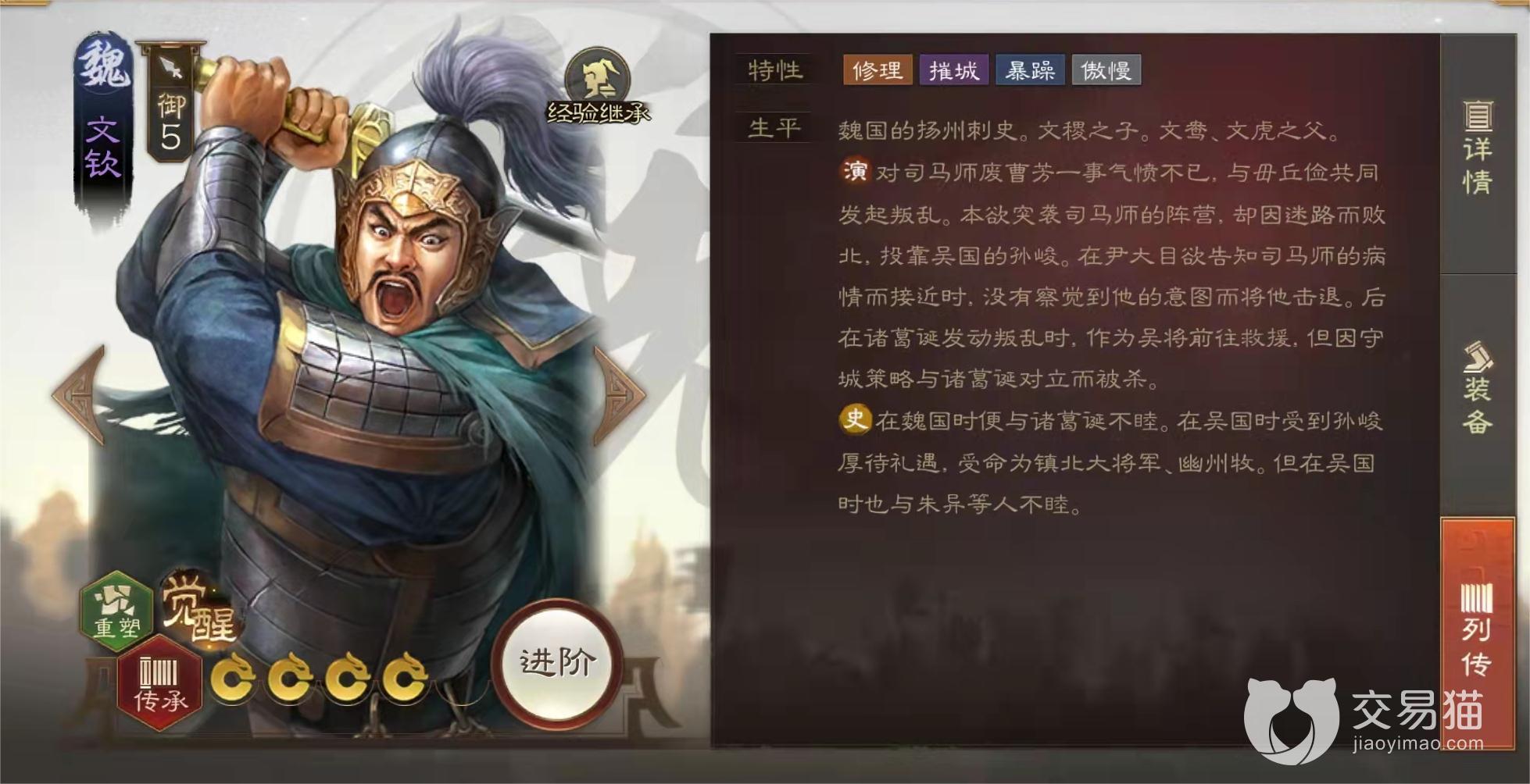 那么关于“三国志战棋版文钦怎么样”的内容到这里就介绍完毕了,该武将在属性上比较平庸,不过武力和统率还是可圈可点的,另外他的战法以及特性都保证了他有着充足的持续伤害,前期开荒的时候可以稍加培养一下。