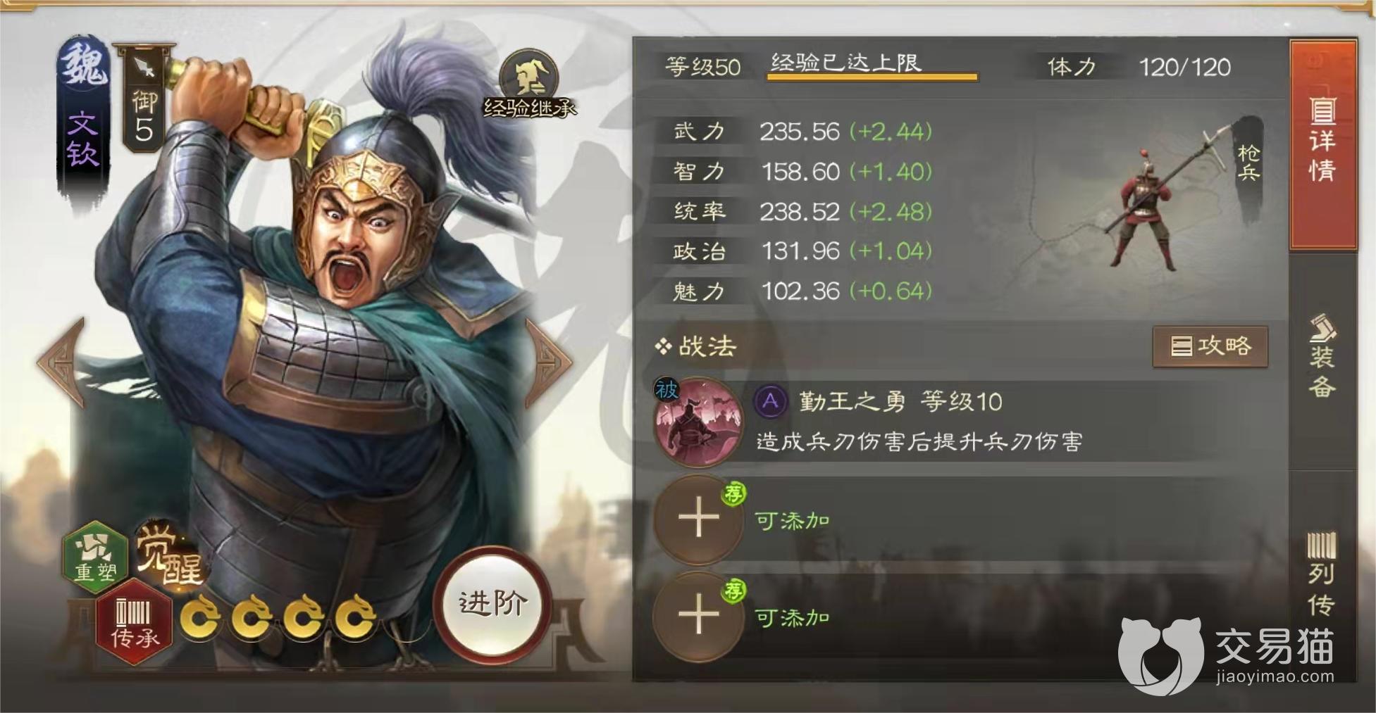 首先文钦在属性上满级分别可以达到武力235.56,智力158.60,统率238.52,政治131.96和魅力102.36的水准,这其中它最高的两项数值还是在武力和统率上,由此可见他非常擅于征战沙场,因为这两项属性都是与部队攻防属性息息相关的数值,然后他作为一个枪兵,虽然各项数值没有特别顶尖的,但破两百的武力也足够在关键时刻补刀了。