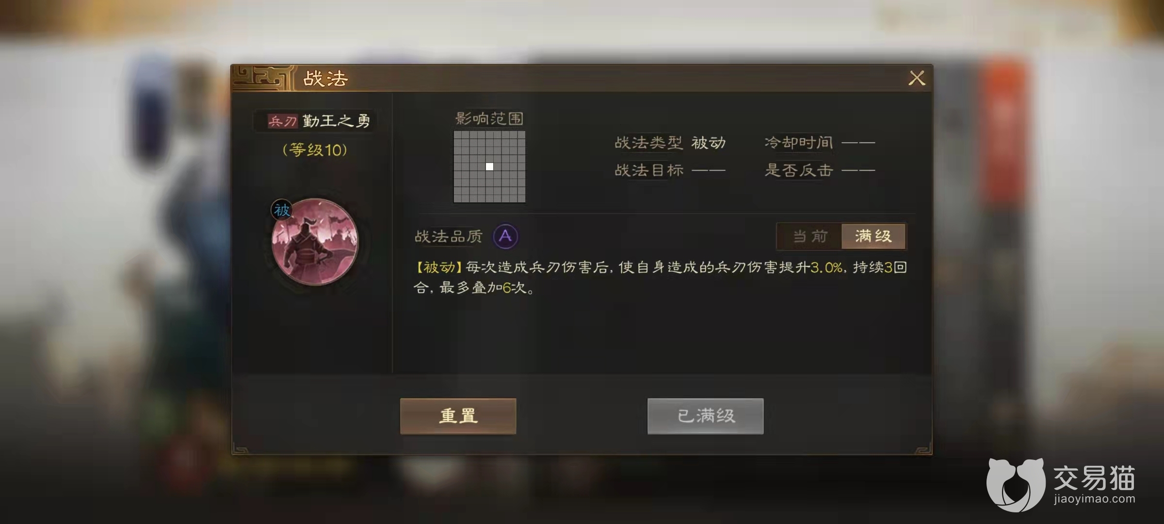战法方面,文钦享有的是一个被动,具体效果表现为每次造成兵刃伤害后将提升后续的兵刃伤害3%,该效果可以叠加最多六层,并且每层的持续时间都可以达到三回合,因此该武将在实战中肯定是越战越勇的类型,只要生存到了后面,他的伤害肯定是非常不错的。