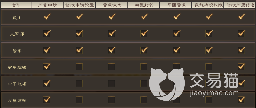 每个职位都有自己的专属权限,盟主可以点击官职权限来对除盟主之外的所有官员的权限进行划分,能够赋予或者取消官员的一些管理权限,在权利释放出去的时候,一定要注意该玩家对同盟是否忠心,在战争策略游戏中,难免不了勾心斗角,因此在官职人员的选择上一定不能够马虎。