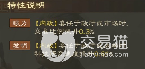 而韩暨的特性对内政的加成也比较高,“眼力”当委任于主政厅或者市场的时候,贸易交易直接的比例提升0.3%,能够更加促进玩家之间主城的贸易交流。“发明”当委任主政厅或太学科技研发速度提升0.61%。