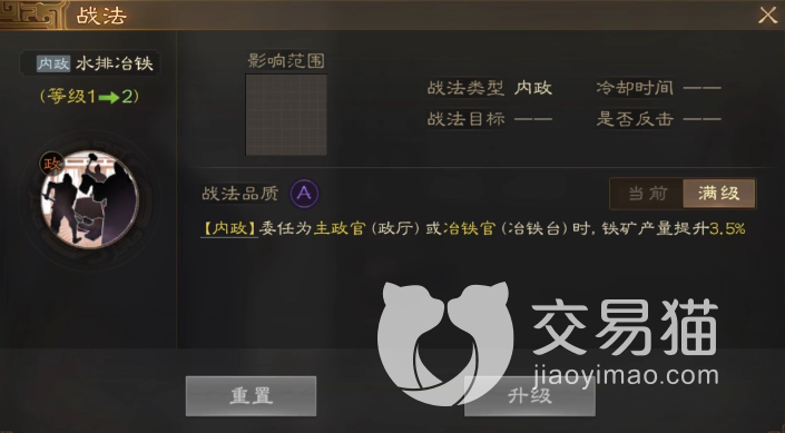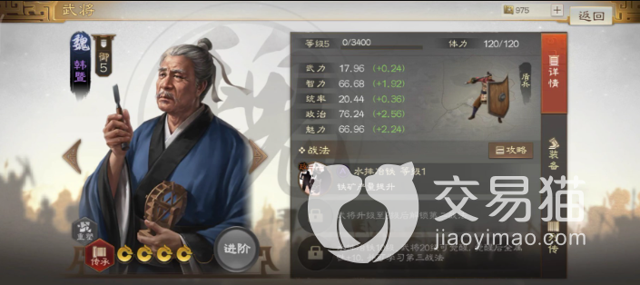 韩暨的战法技能也是属于内政型的,所以在战法上也是以内政为主,当韩暨委任主政厅或者冶铁官时,铁矿的产量提升3.5%。虽然大家看着这点睡醒加成可能很少,但是在玩家前期还是非常重要的。