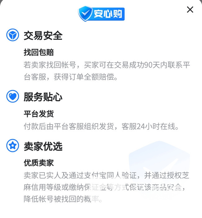 账号安全性必定是账号买家最最关心的内容,因此交易猫平台也出台了一系列保障账号安全性的举措。要说交易猫平台内哪些订单的安全性最高,那一定要数带有“安心购”字样的订单了。从字面意思即可看出,这种订单几乎属于只要心仪就可以闭眼无脑买的程度,因为这些账号的保障服务太全面了,尤其是交易成功90天内的找回包赔服务,就是一般平台比不了的。