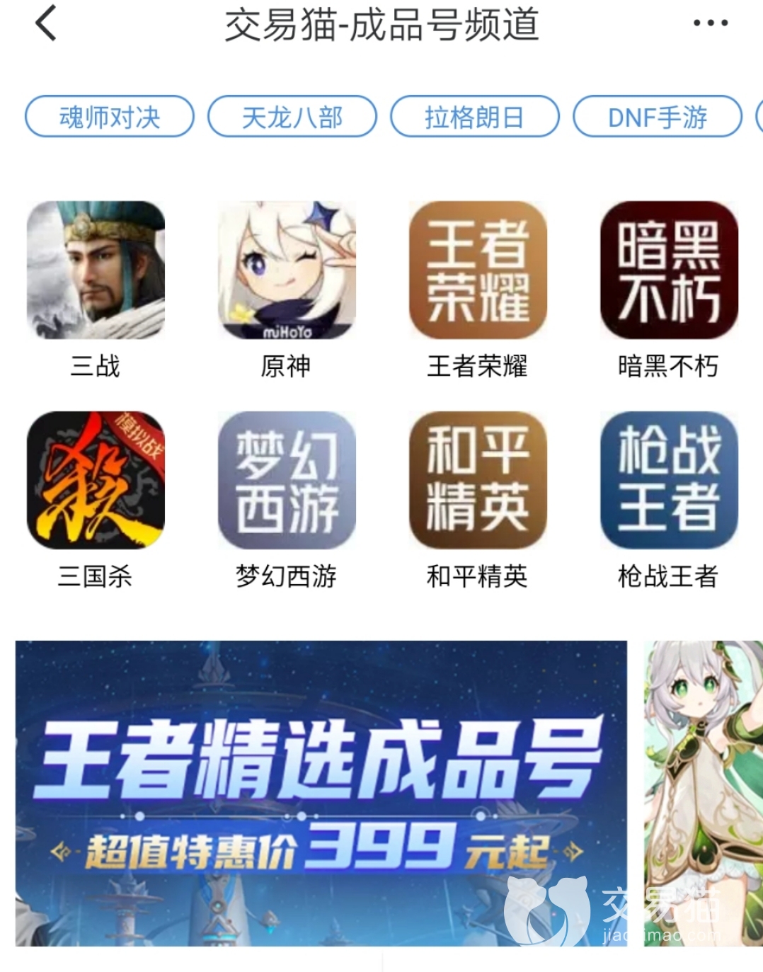 交易猫理由很多便宜的靓号,大家想要买什么游戏的靓号,只要搜索游戏然后找到销售专区就可以了。在平台首页就显示目前热门的游戏,如果热门游戏里不是大家想要购买的,可以在引擎那里输入游戏名精确查找,这样找到账号的速度更快。