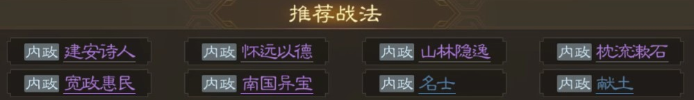像这种内政武将其实就不讲究阵容的搭配了,它可以与其他内政武将一起在政厅发光发热,可以帮助我们发展势力,出谋划策,属于文臣一样的存在了,而且他能使用战法也都是与内政有关的,小编也具体的列举了一些使用的战法,玩家们可以作为一个参考选择使用。