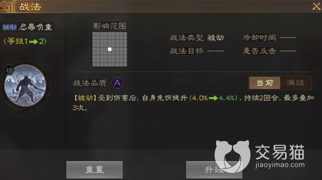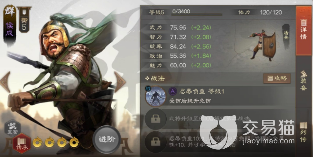 从基础属性上来看的话,这个角色的属性其实并不怎么样,他的统率能力有84,其他属性值的话,武力和智力在70以上,剩下的都在60以下,这即便是在四星级武将中也属于一个中等偏下的水平了,他拥有辅助的战法能力,是一个被动的效果,为忍辱负重,在受到伤害时可以提升自身免伤效果,持续时间为两回合,最多可以叠加三次。