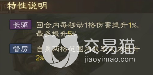 他的战斗特性也是为了帮助队伍输出而存在的,拥有长驱和督厉两种特性,长驱的话可以在回合内移动格子提高我们的伤害,最多可以提升5%,而督厉的话,则是在自身两个格子范围内,我军武力值提升2%,属于一个辅助型的特性,能够帮助队伍快速的进行输出,他没有同队加成的效果,这也就意味着在任何队伍中他都可以取代辅助进行使用,不过仅限于四星武将阵容,如果是在五星阵容中这个角色用起来其实是有些吃力的。