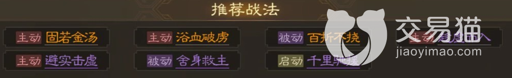 这个角色在阵容的搭配上主要就是选择那些强有力的输出武将,毕竟自身的输出效果不是很强势,只能搭配强有力的输出武将来弥补缺点。至于战法的搭配上,玩家们可以选择固若金汤、百折不挠等等,下面有详细的推荐战法,玩家们可以参考一下。