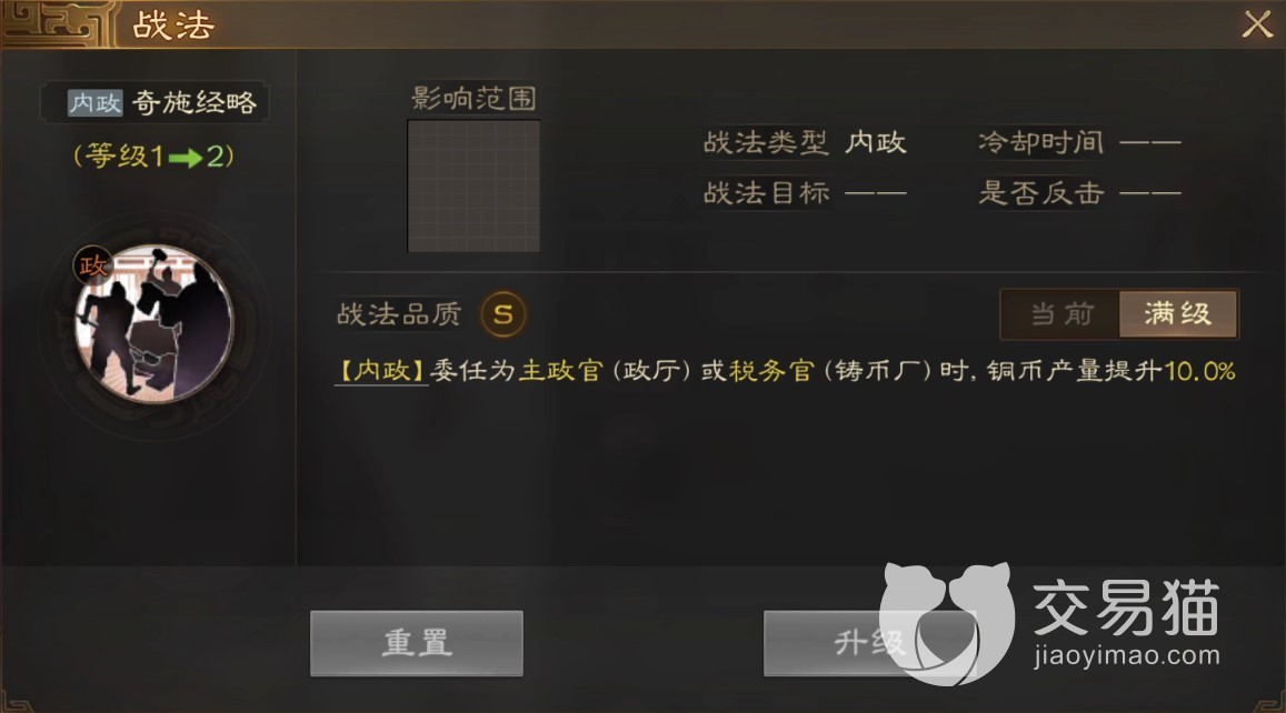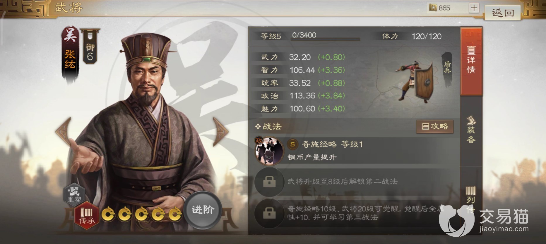 铜钱多了事情就好办了,游戏中许多资源的获取都需要用到钱,所以张纮虽然各方面属性都不错,但功能却比较单一,作为主政官提供铜币产量是他的最大职能。然后就是他的传承战法给到一些谋略输出类的智将,还是能有所发挥的。