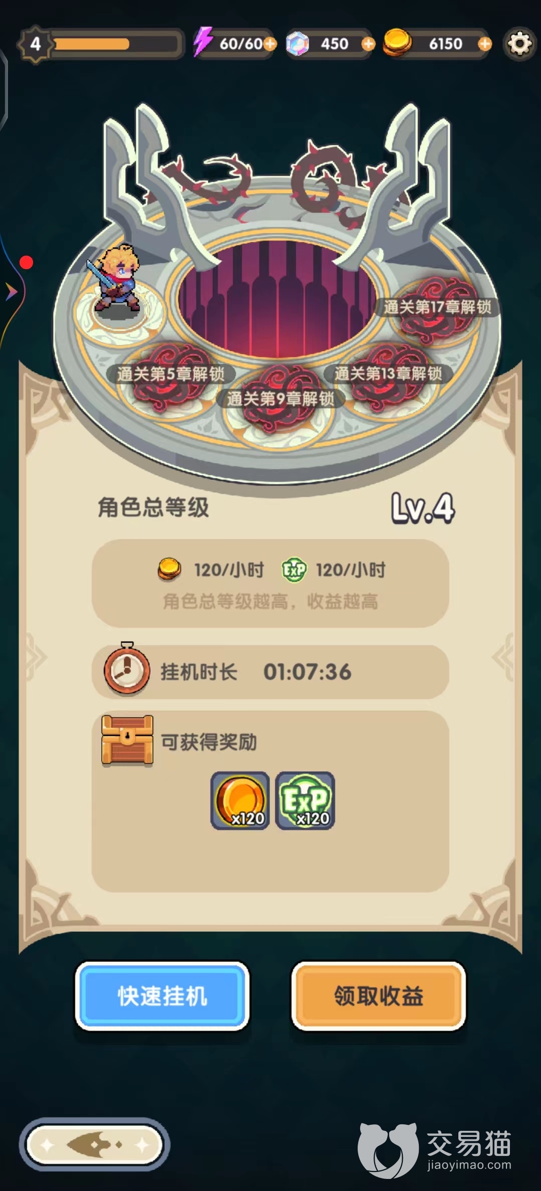 第三种则是挂机收益了,也可以称作放置收益,在游戏中玩家可以直接领取挂机收益,所以不用担心没有时间玩游戏不能升级,挂机收益或许不能直接提高玩家的角色能力,可累计起来同样是不小的收益,尤其是在角色提升到一定等级后,每次的挂机收益都是一笔十分可观的奖励。