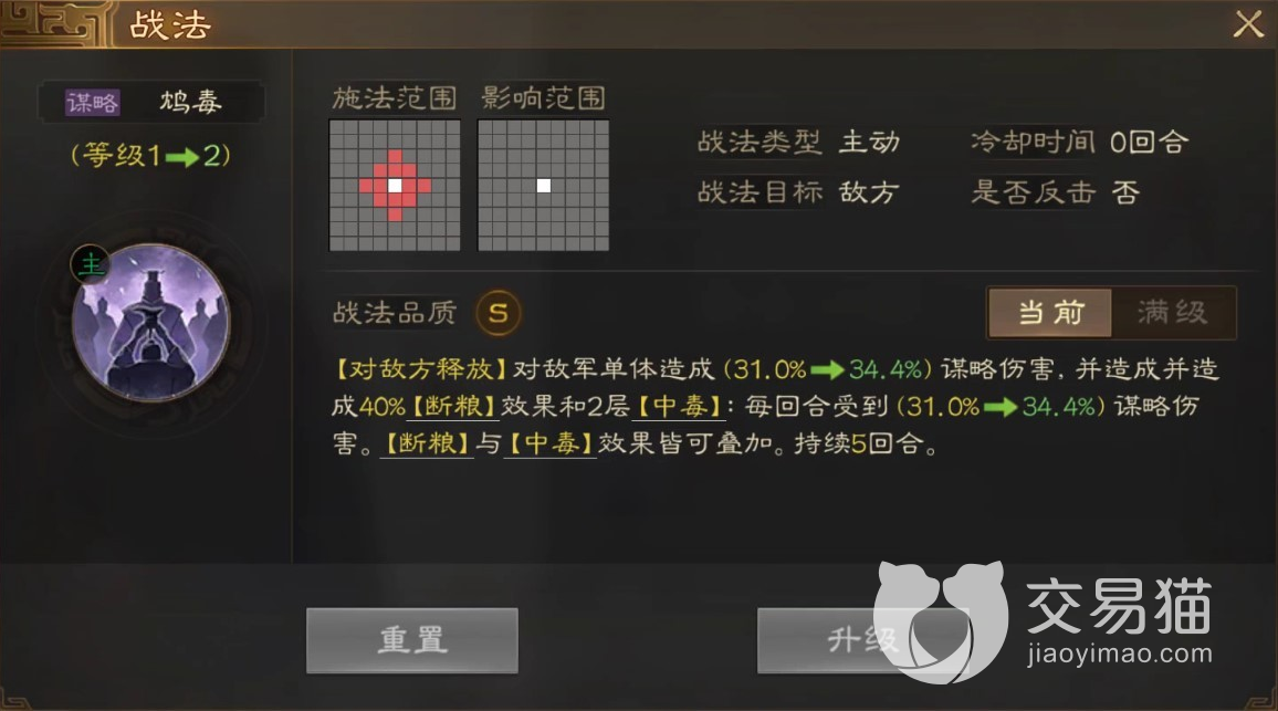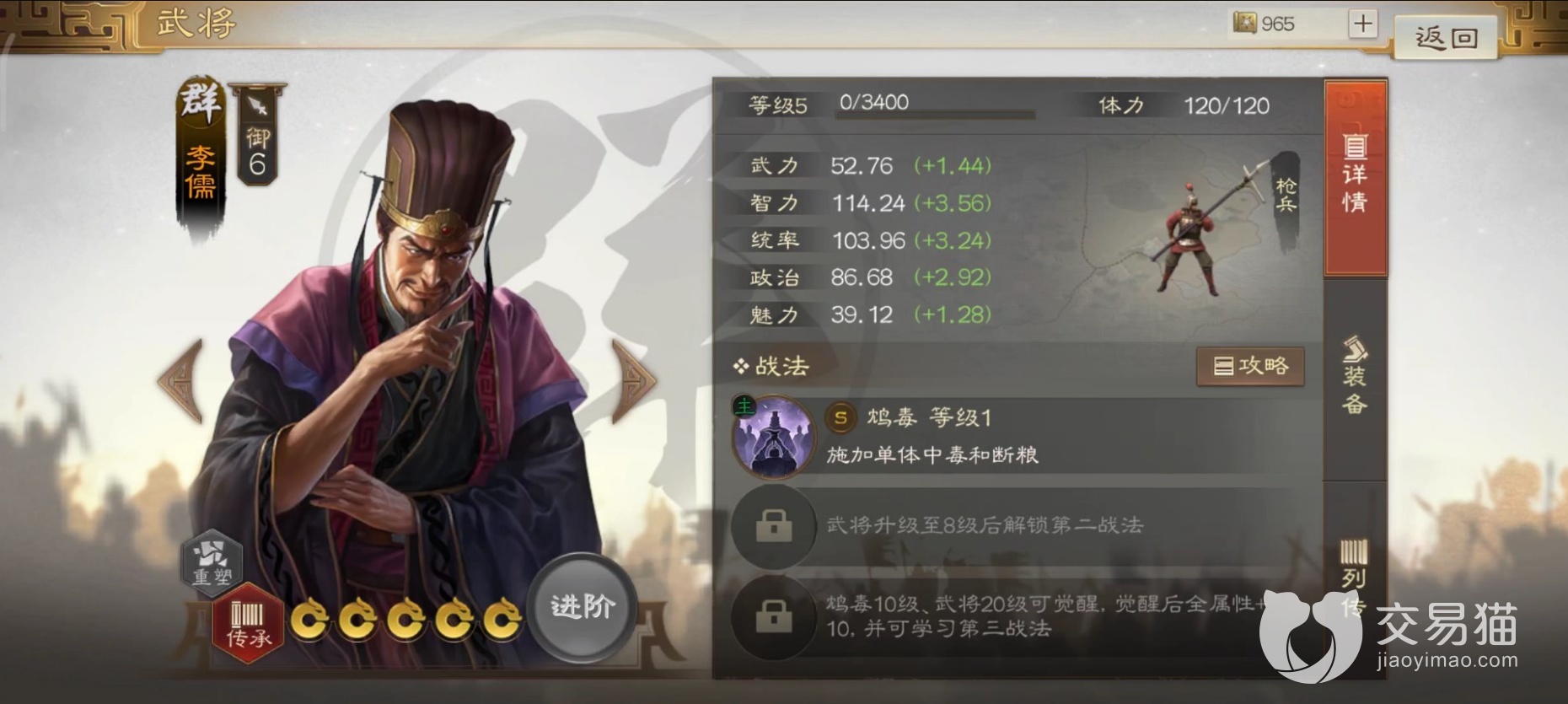游戏中每一名武将最多携带三个不同战法,除了抽取到的时候自身携带的之外,另外两个可以自由组合搭配,这样就形成了非常个性的养成路线。对于李儒来说,自带战法效果非常丰富,既可以对敌方单体造成谋略伤害。还可以附加断粮和中毒效果,这两个都是游戏中非常有效的状态性技能,被断粮影响的目标接下来回复兵力降低,中毒则是持续回合内不断掉血,而且这两个效果效果可以叠加,也可以和其他队友技能一起生效。