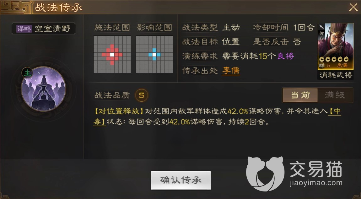 在不考虑其他阵容搭配情况下,小编建议是尽量让异常状态类限制更加丰富,同时中毒效果也要加强,这样即使没有其他队友帮助自己也可以叠加起来。所以推荐的两个战法搭配组合为空室清野和挟魂夺魄。其中空室清野为自身传承之后所获取技能,虽然效果上非常贴合,不过需要多抽取几张卡牌后才能获取到。效果是对指定范围内敌军进行伤害,并且附加中毒效果,这样两个技能中毒可以相互叠加起来,单单是持续伤害就已经非常可观。
