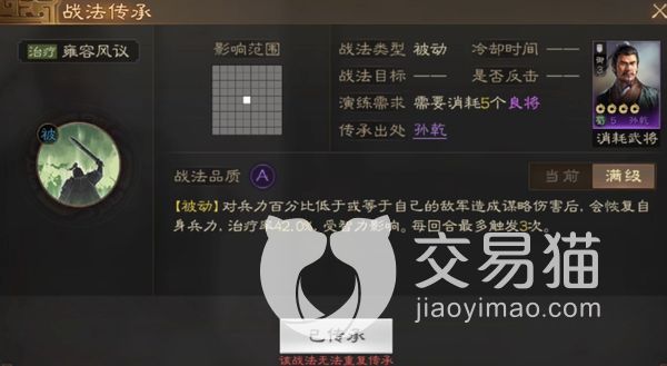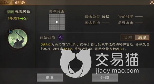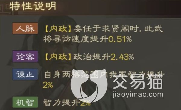 这个技能在恢复的治疗率上,大概是在42%左右,每一个回合还能最多触发三次,它是一个被动技能。而在自身特性上,可以看出这个角色也主要在内政上更有发展前途。