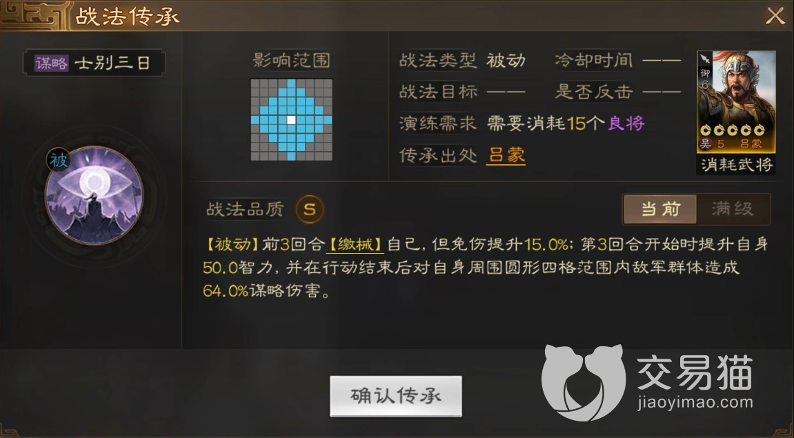 空室清野由李儒分解后获得,效果除了群体伤害外,还能为所有的目标附加上中毒状态,中毒属于持续伤害类型,受到智力影响。这样就拥有了两个不同类型持续伤害技能,在诸葛亮高智力加成下,单单持续伤害就已经非常可观。除此之外还有一个备选技能就是吕蒙分解后获得的士别三日,以缴械自己为代价获得免伤,后续只需要撑住三个回合,就可以极大提高智力属性,属于战斗中期发力类型。