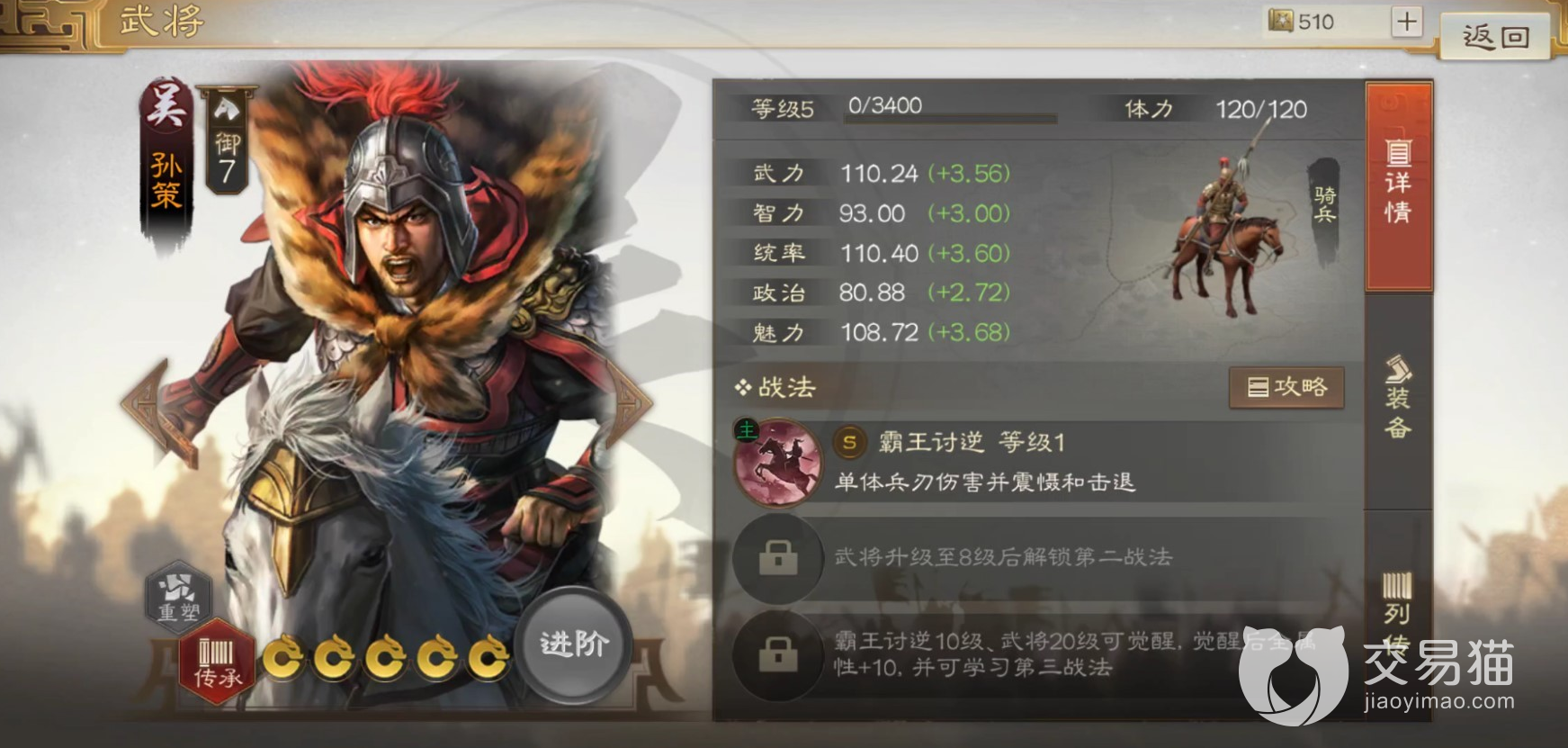 孙策自身属性无论是武力还是统率值都非常可观,完全称得上是超一流武将,这就为后期输出和防御带来属性上的基础。接下来是自身战法效果,自带技能霸王讨逆,选择单体目标为输出对象,在造成兵刃伤害后可以对其进行震慑,并且击退两格。如果在击退过程中触碰到其他目标,则对被撞击目标也会造成额外伤害,所以在释放时候比较讲究角度和目标,选择稍微考验一下操作。附带震慑是很好的控制状态,这样孙策就既有输出又有控制,非常全面。