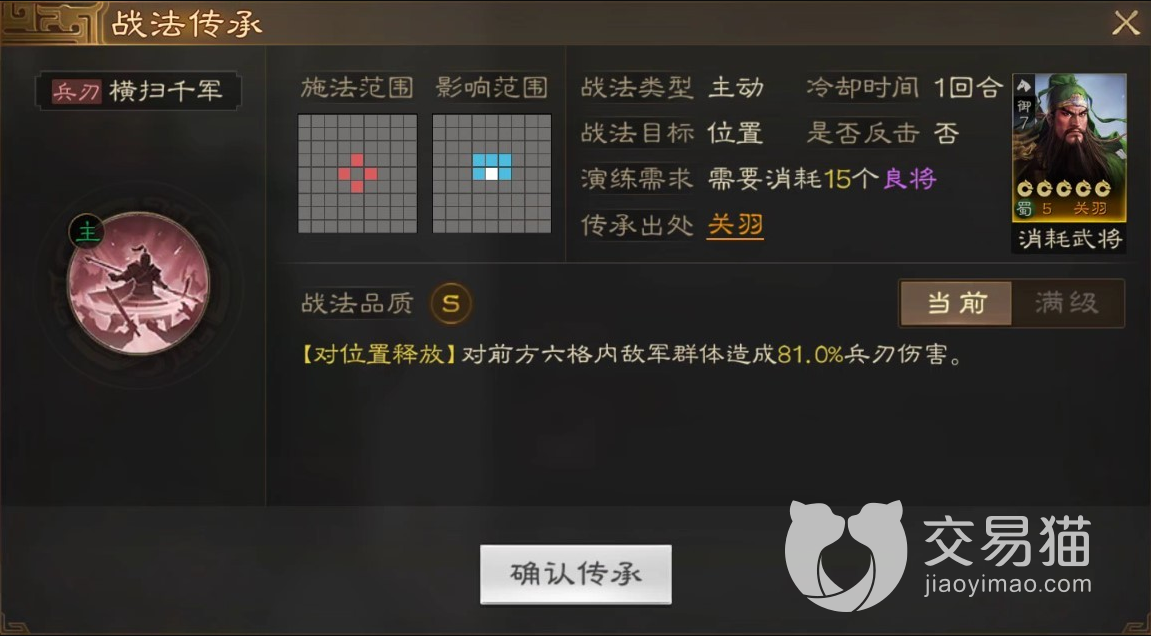 无论玩家想走吴国均衡阵容或是控制队,孙策都是必不可少的一员,而且在战法选择上以橙色为主,前期可以先用紫色过渡,但一定要尽快更换。只有橙色的横扫千军和破阵催坚才是最适合孙策的选择搭配。横扫千军由关羽分解后获得,伤害目标为前方六格以内所有敌军,也需要适当找一下输出位置,尽量涵盖更多目标,将高武力值所换算成兵刃输出最大化。