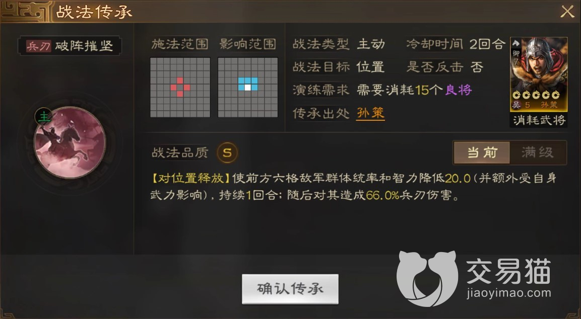 破阵摧坚施法范围和横扫千军完全相同,但是效果却变为了降低伤害目标身上的统率值和智力值,这两名属性影响的除了有谋略输出外,还有兵刃防御和谋略防御。降低了属性之后既削弱了输出,又提高了我方其他队友伤害,可谓是一举两得。随后附加的兵刃输出也极其可观,这样搭配起来孙策既有单体又有群伤。