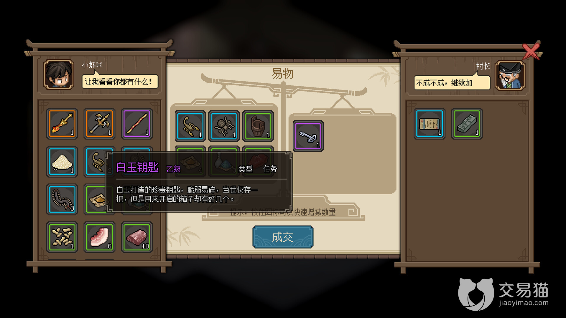 然后在楚襄城卖书的人,以及捕快都会有以物易物的功能,也有一定概率刷出来碎银,这个你可以不断调整自己这边的道具来让对面的npc来调整他们用于交换的道具,从而刷出碎银。