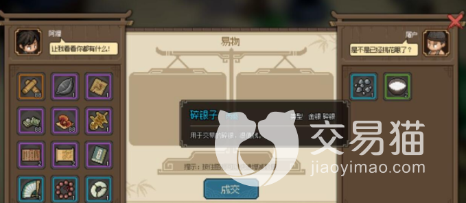 碎银在目前的试玩版本中有几种不同获取方法,首先是找npc进行以物易物,屠夫这个npc这里,你和他换东西的时候,有概率从你给出的道具中换到碎银,可以看到这属于丙级道具,描述是用于交易的碎银,很值钱。