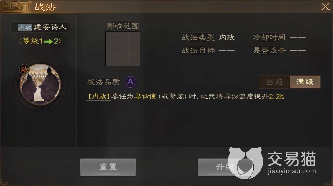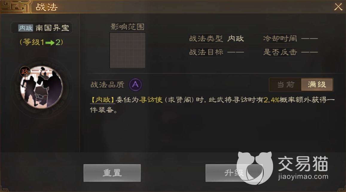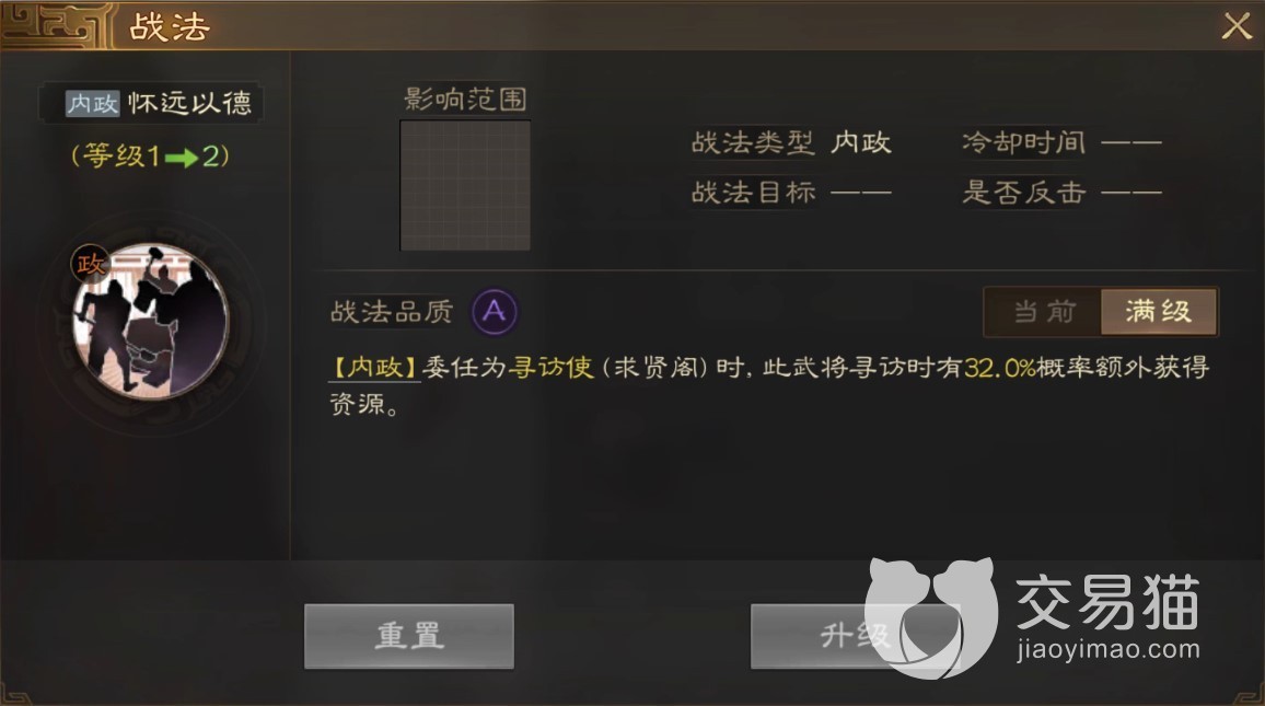 因此他的贡献主要是在内政这一块,搭配“南国异宝(传承自士燮)”、“怀远以德(传承自刘虞)”这两个战法,前者是在武将寻访的时候概率获得一件装备,可谓一举两得,后者则是在寻访的是概率获得额外资源。