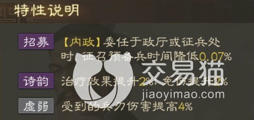 自带的战法“建安诗人”可以提升最高2.2%的寻访速度,特性能小幅降低预备兵征召时间。“诗韵”略微提高受治疗效果并且有小幅免伤提升,但“虚弱”的特性会额外受到4%的兵刃伤害,这使得他难以作为前排上战场。