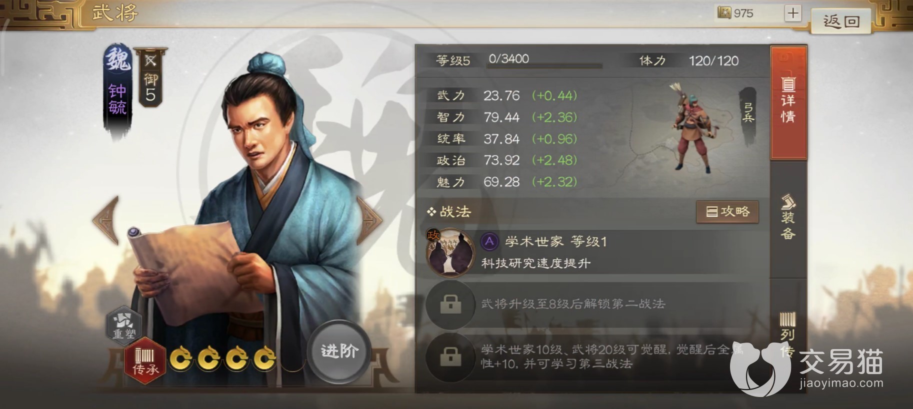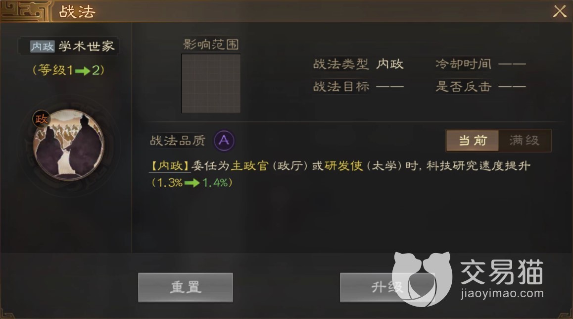 其武力成长甚至0.5都不到,所以用来作为武将是不太合格的,突出的属性是智力政治和魅力,所以作为管理主城的官员是没啥问题的,战法学术世家也侧面证明了这一点,技能的主要效果就是提高科技研究速度。