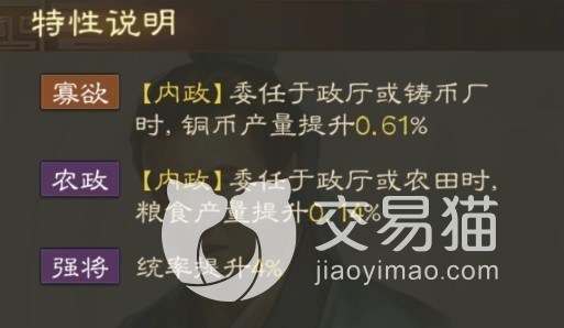 在特性方面,说明了钟毓在管理内政的能力上是没有多少问题的,提高铜币产量,提高粮食产量,基本在主城中几个设施都可以施展拳脚,提升一点点的统率反而没什么吸引力了。