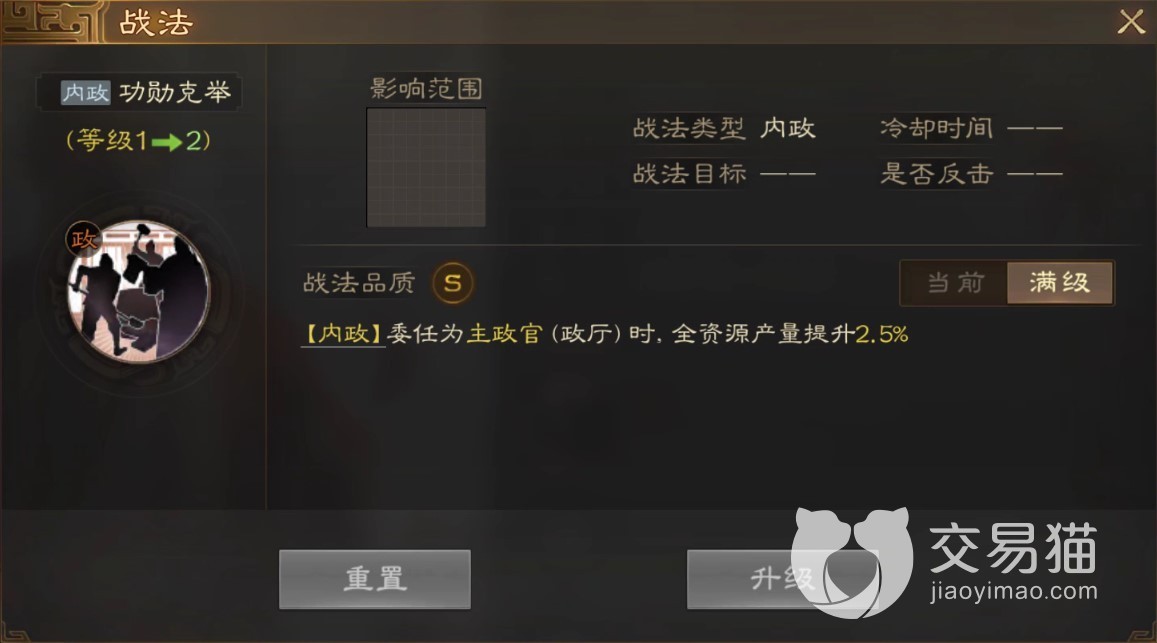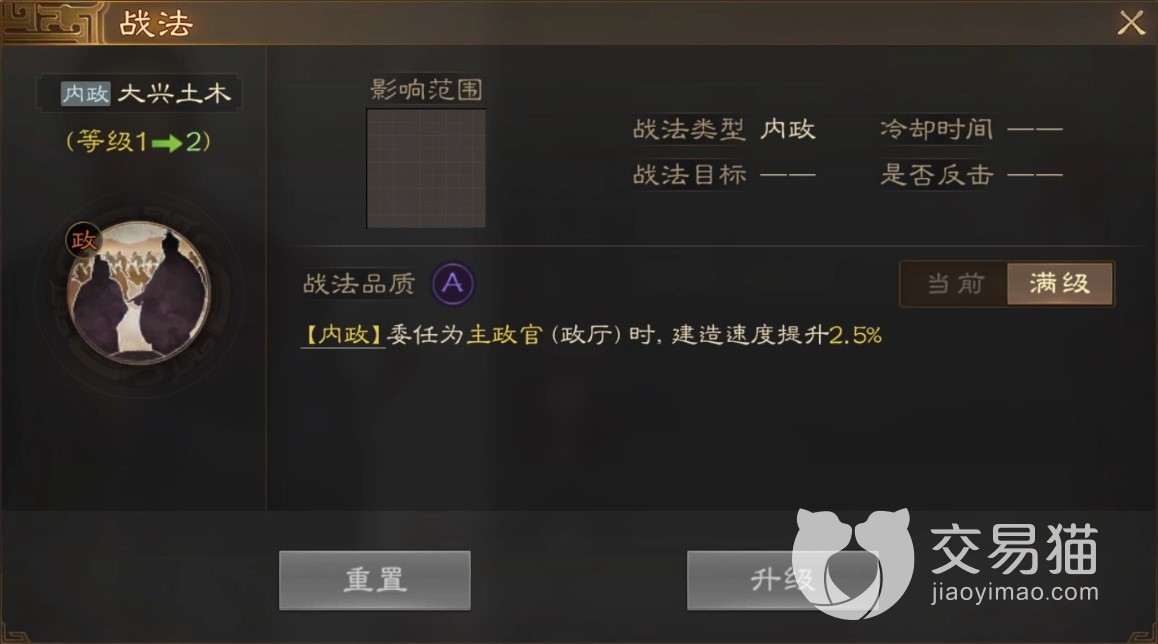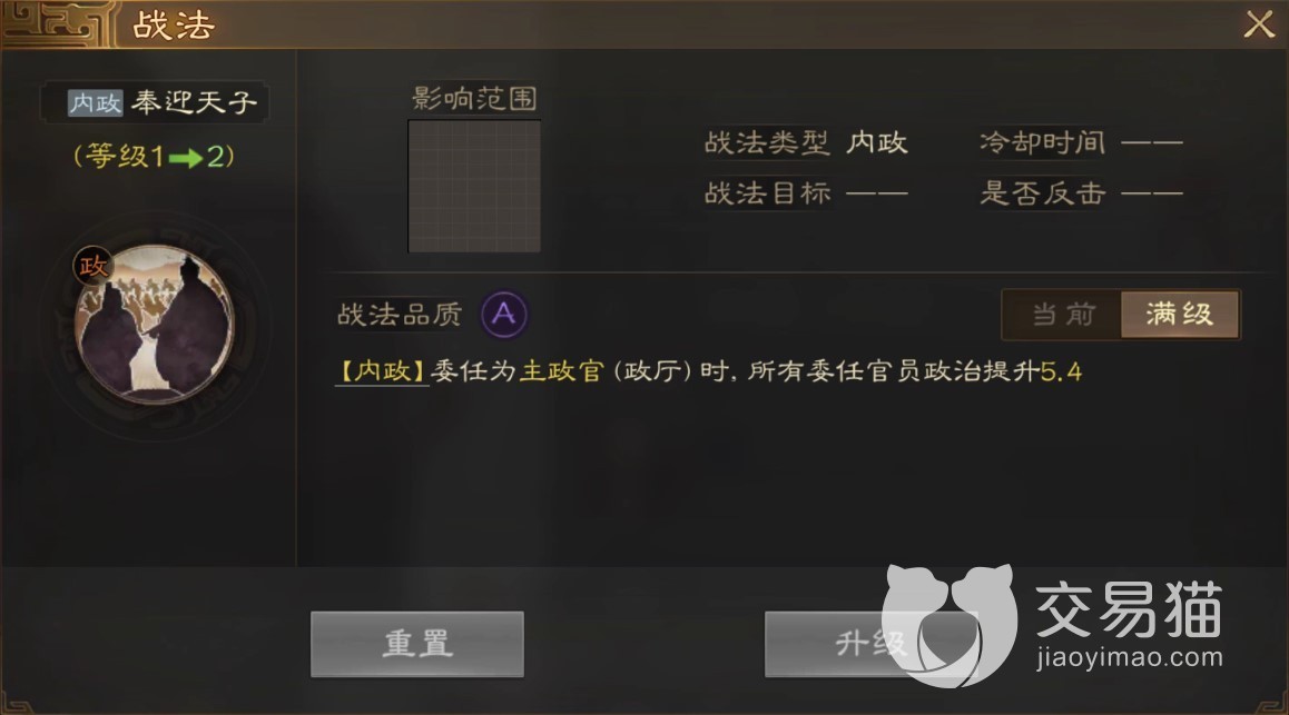 第3个战法推荐“奉迎天子”,来自董昭的战法,当他作为主政官的时候,可以提高所有委任官5.4的智力,虽然单看加的并不多,但要知道这可是对所有委任的官员生效呢!或者用“高风亮节”,都是不错的候选战法。个人会倾向于除了自带战法外,搭配孔孟之道和大兴土木,合计有3.5%的全资源产量和2.5%的建造时间缩减提升还是蛮高的。