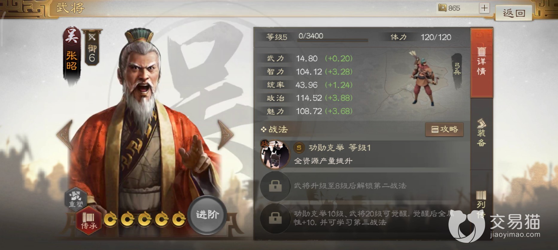 虽然张昭传承战法有不错的功能型,群体谋略伤害外加降智降武,但一般我们并不用他来出战,所以也不用上这个战法。张昭特性还能提升寻访速度、招兵游兵的速度。因此我们再搭配其它2种战法的时候,也是从资源获取和招兵速度方面下手。