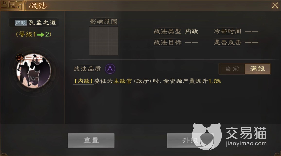 第2个战法推荐用“孔孟之道”,这个传承自孔融的战法,最高可以提升全资源产量1%。或者用“大兴土木”,传承自伊籍的战法,能为建造增速2.5%。