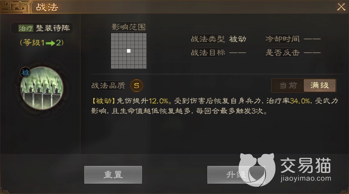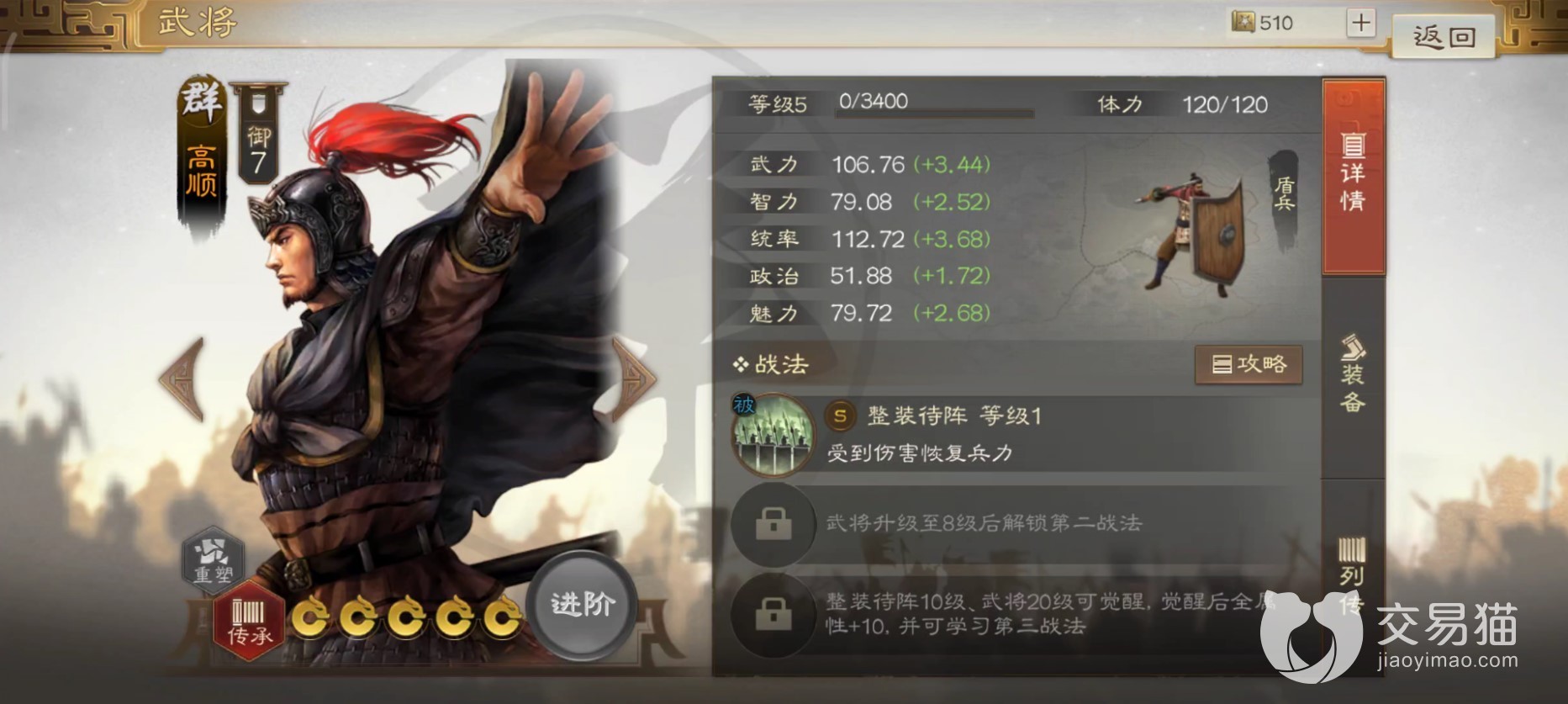 第3个战法推荐用“一夫当关”,典韦的传承战法,能降低周围敌人的移动力与造成的伤害,这样一来只要高顺在前面站着,敌人就难以冲过防线。如果觉得3个金色技能比较难入手,那么紫色“忍辱负重”也可以,只要是能提升坦度的就OK,有资源了再考虑换更好的。