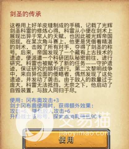 这件道具拥有剑士冈布奥专属的属性加成,同时可以使玩家在升级战士系称号的时候减少百分之九十的探索点消耗,基本可以实现无脑通关。