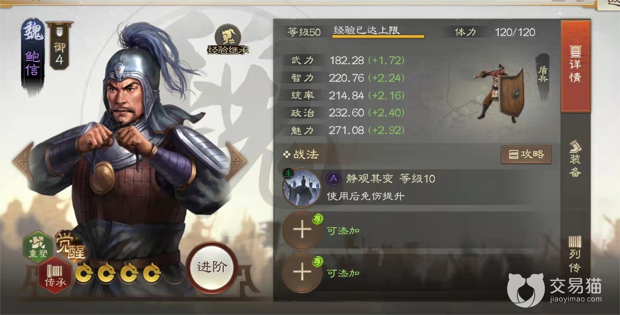 那么关于“三国志战棋版鲍信怎么样”的内容到这里就全部结束了,该武将的属性整体看来十分全面, 不过战法还是更加偏向战斗一些,当然,你把他放在主城担任寻访使也是不错的,因为其魅力非常高,比较适合武将的寻访。