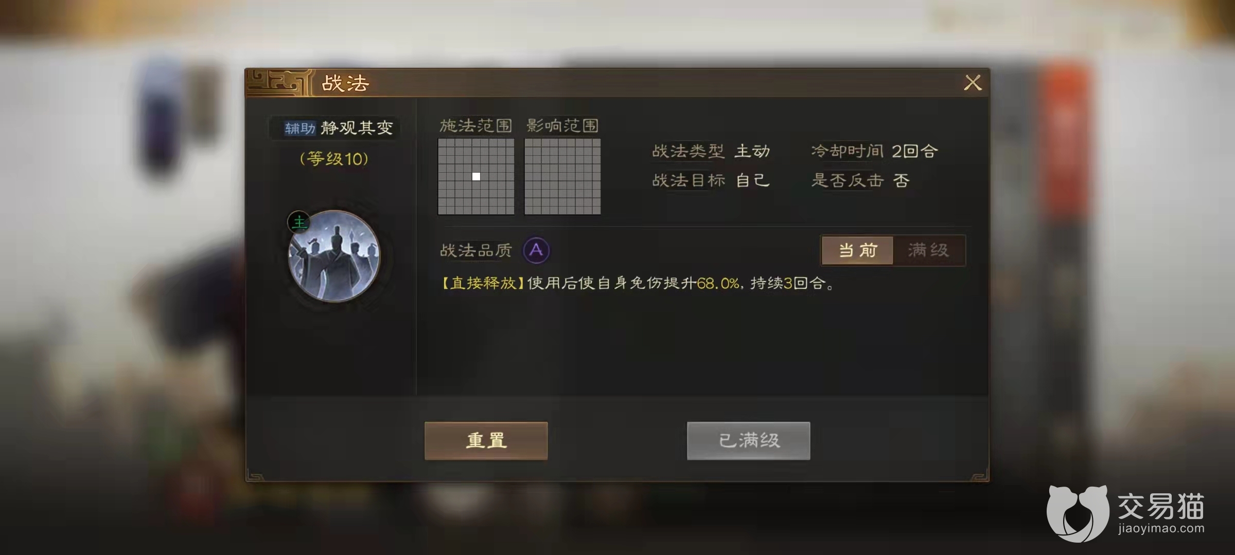 战法上,他自带“静观其变”,虽然标签打的是辅助型战法,但实际效果却是直接为自身增加68%免伤,而且该战法的持续回合数达到了三回合,冷却时间也只有两回合,基本上卡好节奏是可以一直续的,再结合其本身部队兵种为盾兵的特点,可以说他绝对是当之无愧的强力前排。
