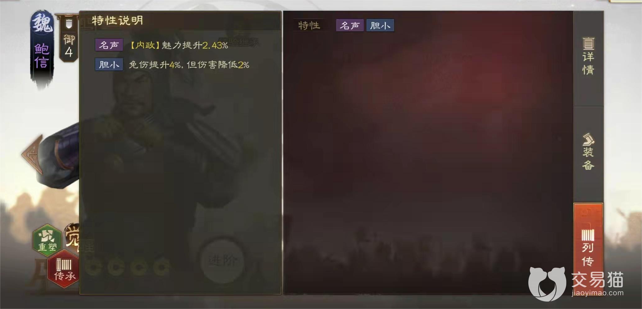 特性上鲍信只有两个,分别为“名声”和“胆小”,其中“名声”是内政向的特性,可以让鲍信本就高超的魅力额外再提升2.43%,这对于之后招揽名将会起到很大的帮助。另外“胆小”则是一个带有负面性质的特性,它会使报信的伤害降低,但同时也会给予4%的免伤作为补偿。