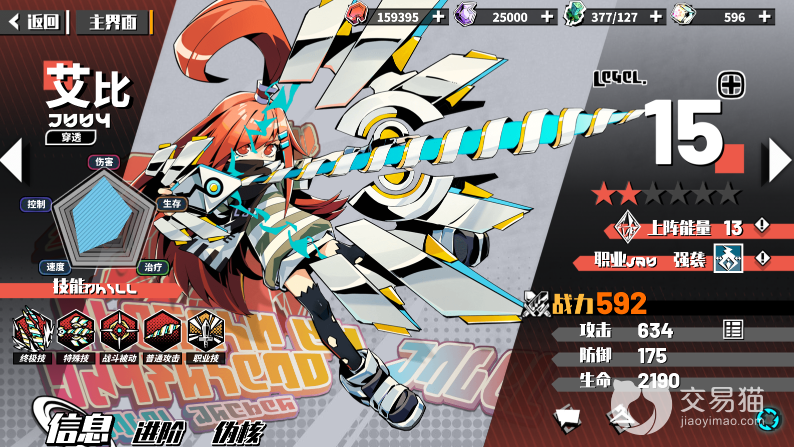 艾比的上阵能量是13,职业为强袭,她伤害很高且速度很快,是属于穿透型的角色,她的技能可以让自身的伤害率提高,且如果队伍中有埃米的话,她没击杀一个敌人都能给自己提高攻击和防御穿透,除此之外,她的终极技能还可以射出12支箭攻击敌方任意一个目标,造成大量伤害。