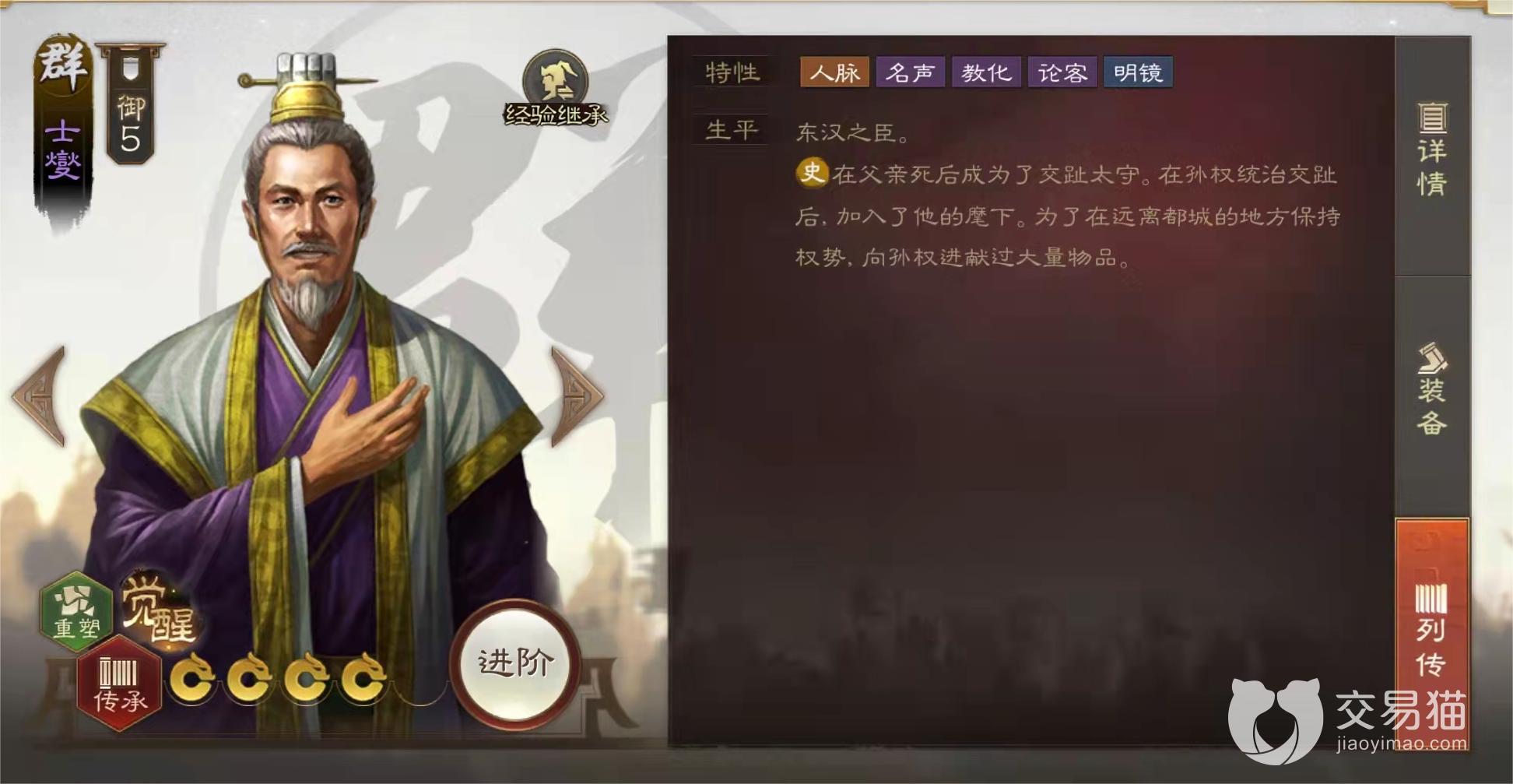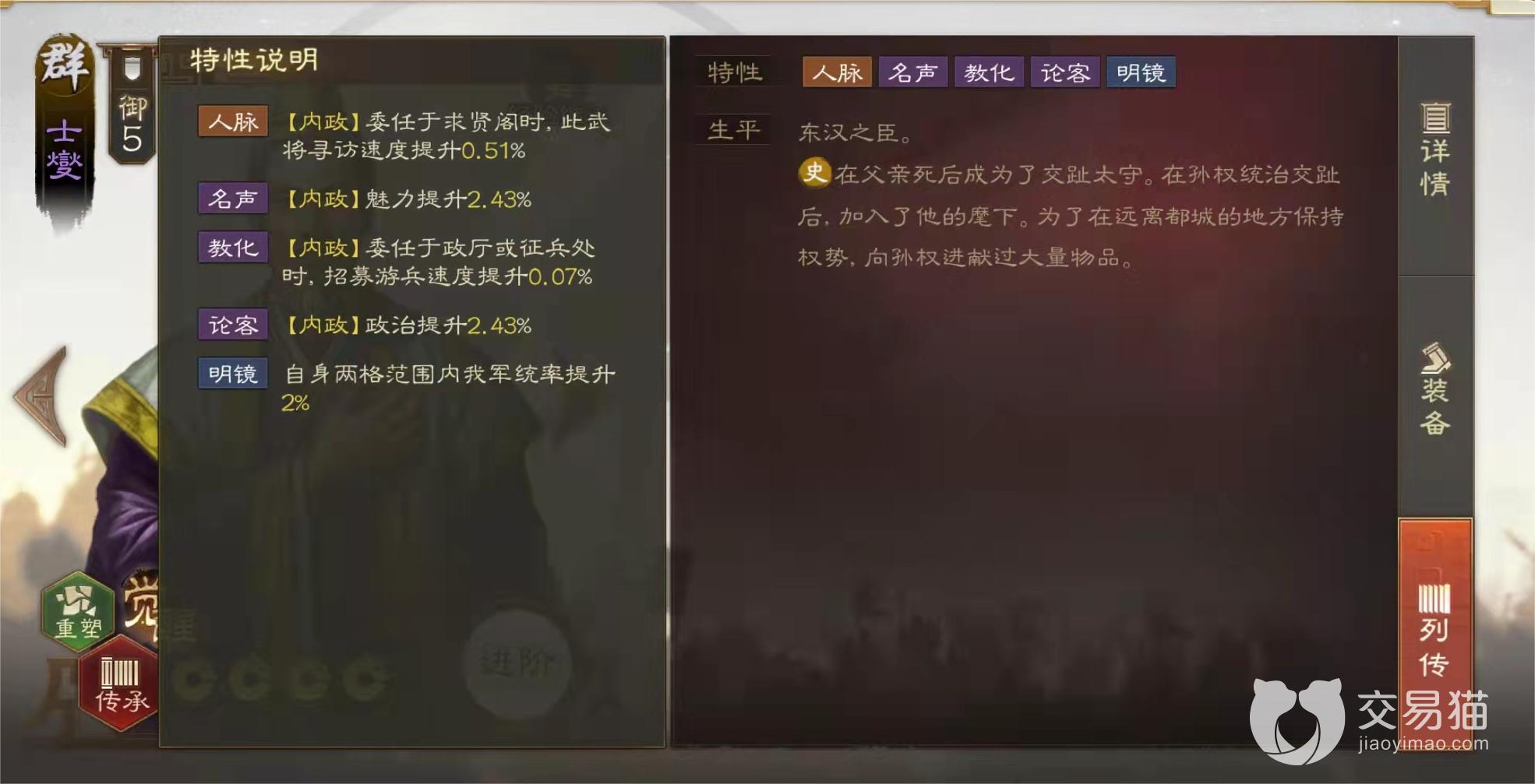 然后特性方面,士燮有着“人脉”,“名声”,“教化”,“论客”和“明镜”五项,这五项其中四个都是作用于内政方面的,这点倒是和其列传中的太守形象很契合。其中前四项特性分别能够在被委任至相关机构时提供关于武将寻访速度,游兵招募速度,魅力以及政治的增益,最后一项则是让其在实战中能够增加周围友军的统率值。