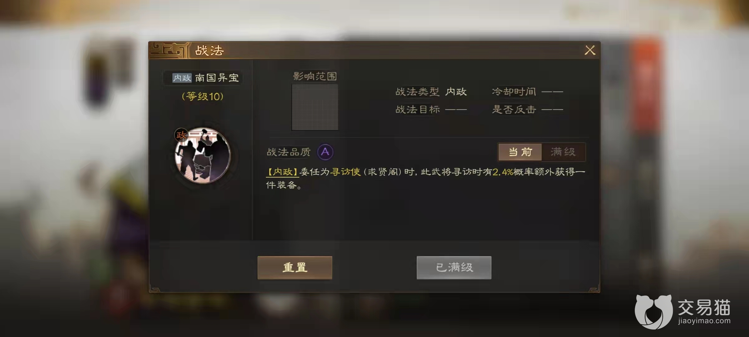 战法方面,由于他是谋士,所以不出意外的其效果是围绕内政进行的,战法名为“南国异宝”,具体效果是在被委任至求贤阁时,会在寻访武将时有一定几率获取额外的装备,这个几率有足足2.4%,次数多了以后还是能够感受到明显提升的,而且装备对于武将本身来说也提供了很大帮助,因此它算是间接提升了玩家阵容的未来潜力。