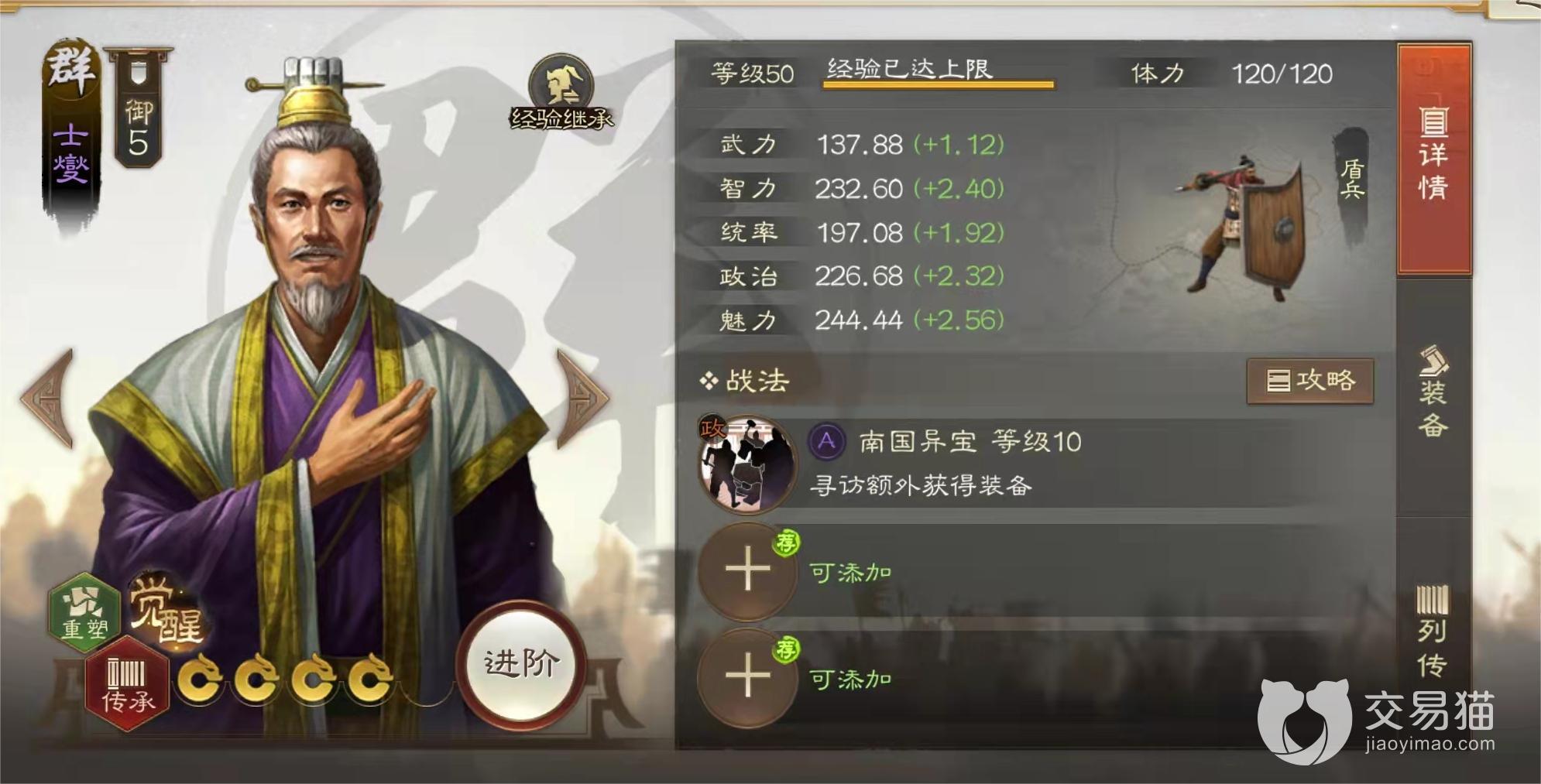 首先从属性来看,满级以后士燮在智力,政治和魅力这三项上都已经突破两百,属于已经达到了游戏中上游的水准,并且可以看到这三项的成长数值都是很高的,因此在前中期于内政上也能提供不错的增益。另外他的统率值也不算低,因此前期实在没武将用的话,也可以拿他带兵去前线稍微顶一顶。