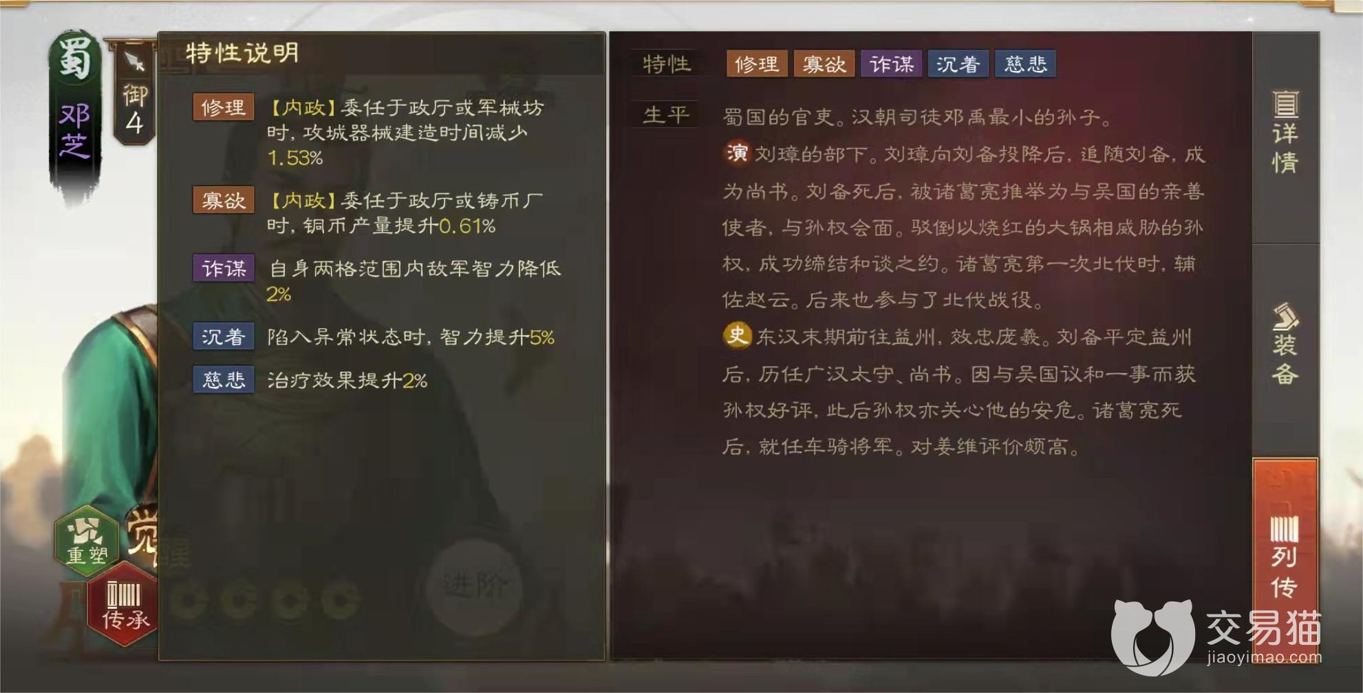 在特性上,邓芝一共有五项,其中“修理”和“寡欲”都是内政方面的能力,只要被委任至相关部门,就能使铜币产量和攻城器械的建造效率得到提升。另外“诈谋”,“慈悲”和“沉着”则基本都是针对于战场上的正面增益,效果包括了对周围敌军智力的减少,以及对自身智力和回复效率的提升。