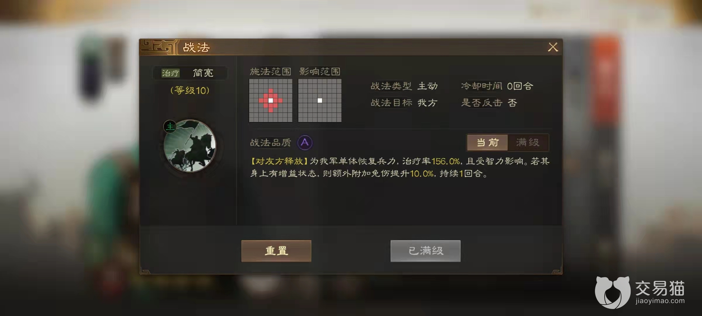 邓芝的战法是“简亮”,本身属于A级品质的主动型战法,效果表现为指定区域内的某一友军为其进行一定量的兵力回复,值得一提的是,该技能几乎是没有使用间隔的,只要敌人的伤害不是太高,那么你就可以一直拯救队内的那个残血。当然,如果他身上有增益,该战法还会为其额外提供10%免伤加成。