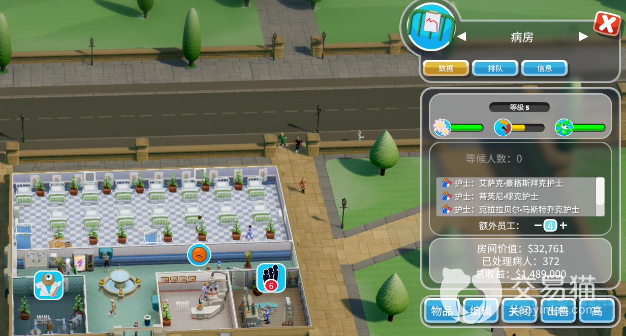 如果病房足够宽敞,还是会出现病人无法及时就诊的情况,这个时候就要从两个方面寻找原因:先看护士和医生的数量是否足够,理想的配置是5张病床搭配3位护士的组合;然后看看是不是游戏本身出现了问题,有的时候因为人物模型判定出错等原因,也会导致病人或护士卡在某个地方无法动弹,这个时候可以点击重新编辑一下病房,就会刷新当前场景,解决问题。