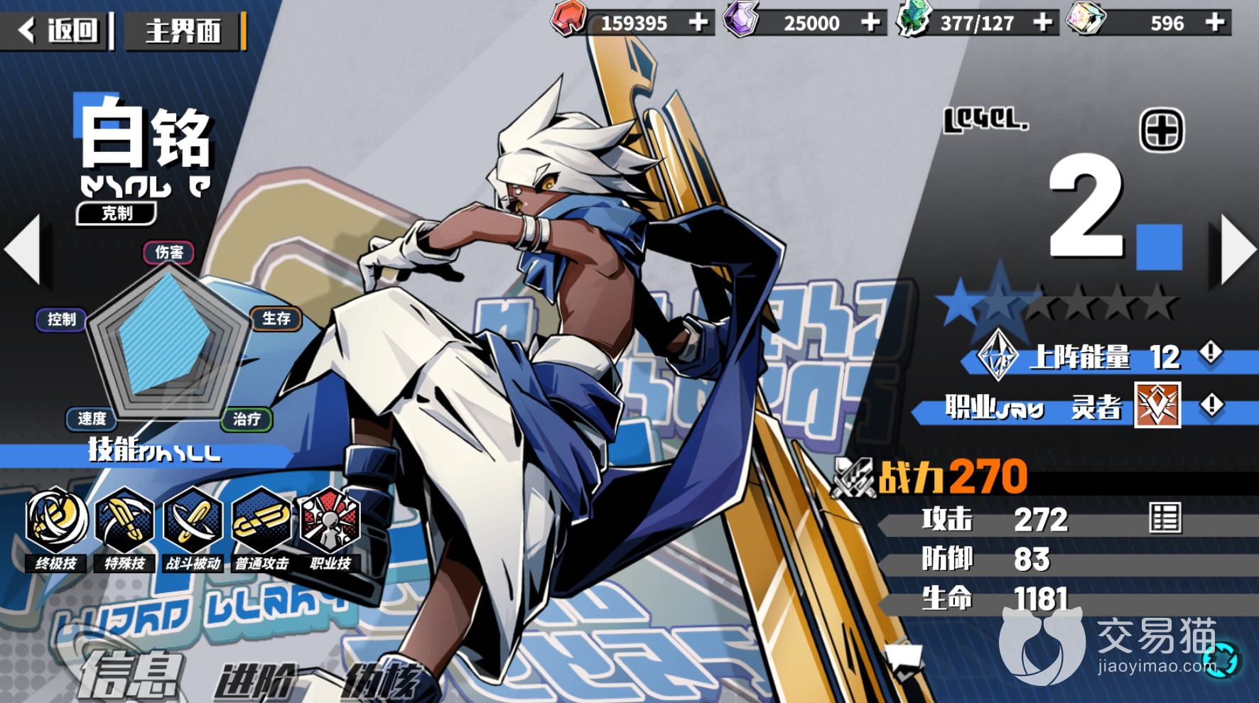 他的伤害很高,速度也很快,所以在战斗中比较占优势,且它的技能可以让他在登场时随机获得增益效果,如果地方任务降低到3个或以下的话,他还会增加攻击伤害,除此之外,他的终极技还可以对地方一整列的敌人造成高额伤害,且在第一次释放终极技之后给自身恢复一定的怒气值。